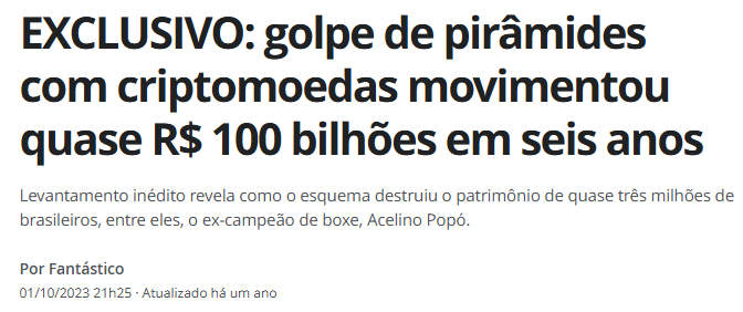 Trabalhando com pessoas e mercado, percebo que as pessoas são imediatistas e buscam retorno rápido. Veja que não existe NENHUM desses charlatões que não use o foco em retorno fácil. Eles movimentam bilhões (caso famoso: Braiscompany) com um discurso repleto de promessas mirabolantes, sem qualquer fundamento ou transparência. É justamente nesse cenário que se proliferam esquemas de pirâmides financeiras, onde o lucro só existe enquanto novos investidores continuam entrando — o que inevitavelmente leva ao colapso e à perda de tudo para a maioria dos participantes