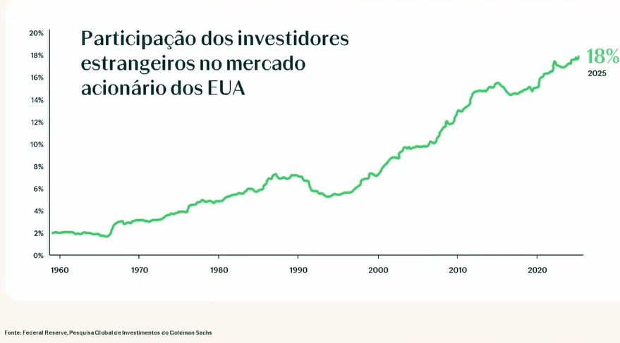 Ao contrário dos rumores, nunca houve tanta entrada de investidores estrangeiros no mercado acionário americano. Atualmente, cerca de 18% do capital das maiores empresas dos EUA está nas mãos de não residentes – um salto em relação aos 5% de meados dos anos 1990, impulsionado pela globalização e maior sofisticação dos fluxos financeiros globais.