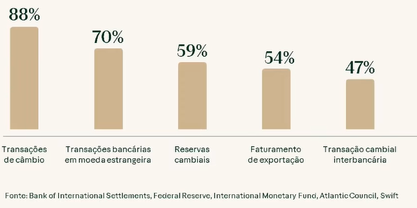 Apesar das narrativas recorrentes sobre o “fim do dólar”, ele permanece responsável por cerca de 90% das transações cambiais globais.
