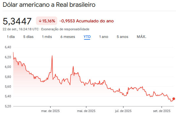 Mesmo com esse histórico de alta, estamos em uma ótima janela dado que o dólar que fechou em 2024 em uma lata expressiva, apresenta uma queda representativa em 2025, conforme dados 22 de set., 16:26:18.