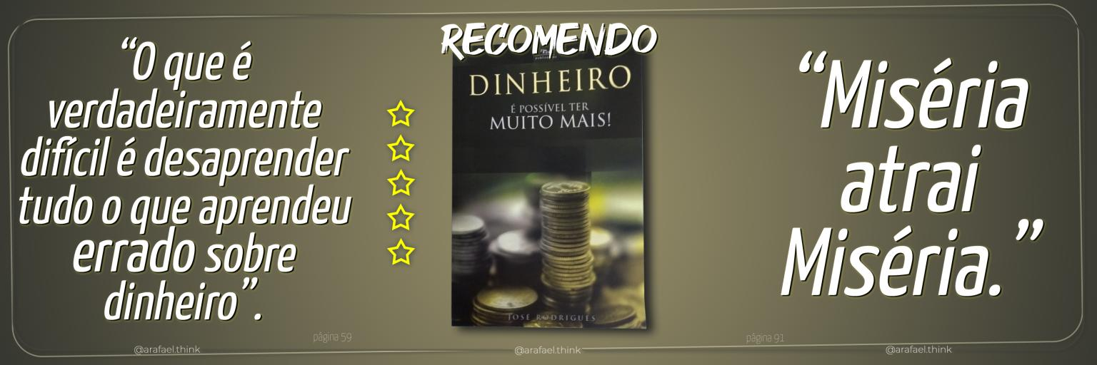 Um dos livros que mudou/despertou minha forma de pensar sobre dinheiro. Sempre escutei que dinheiro era algo ruim, que pessoas ruins tinham, através de atitudes ruins. Notei que, na verdade, o dinheiro é uma matéria que devemos ter DOMÍNIO para lidar com ele.