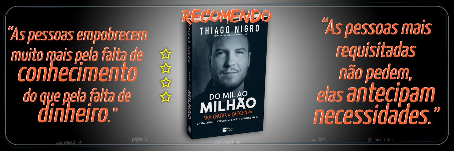 Acompanhando suas redes e conteúdos, observo que o Primo trabalha para ajudar as pessoas na mudança de mindset financeiro e comportamental. O livro é dividido em três partes, onde você encontrará exposições de cenários, produtos e uma breve história da virada de página na vida do autor.