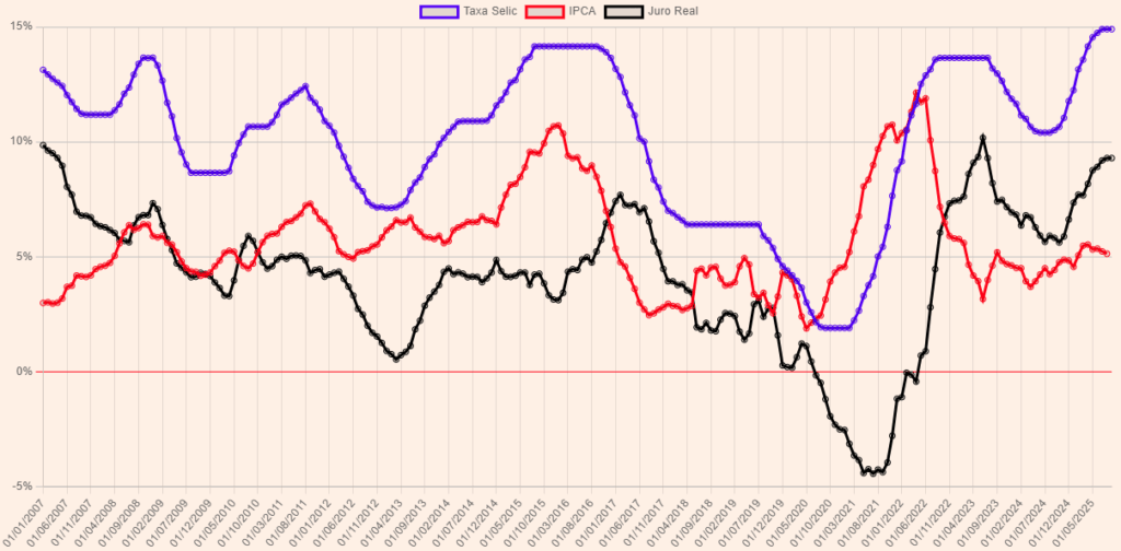 O gráfico abaixo mostra três curvas: a azul corresponde à taxa Selic vigente, a vermelha indica o acumulado do IPCA nos últimos 12 meses e a preta representa os juros reais. Os juros reais nada mais são que o resultado da subtração da inflação (IPCA) da taxa básica de juros aplicada no país, ou seja, a Selic efetiva.