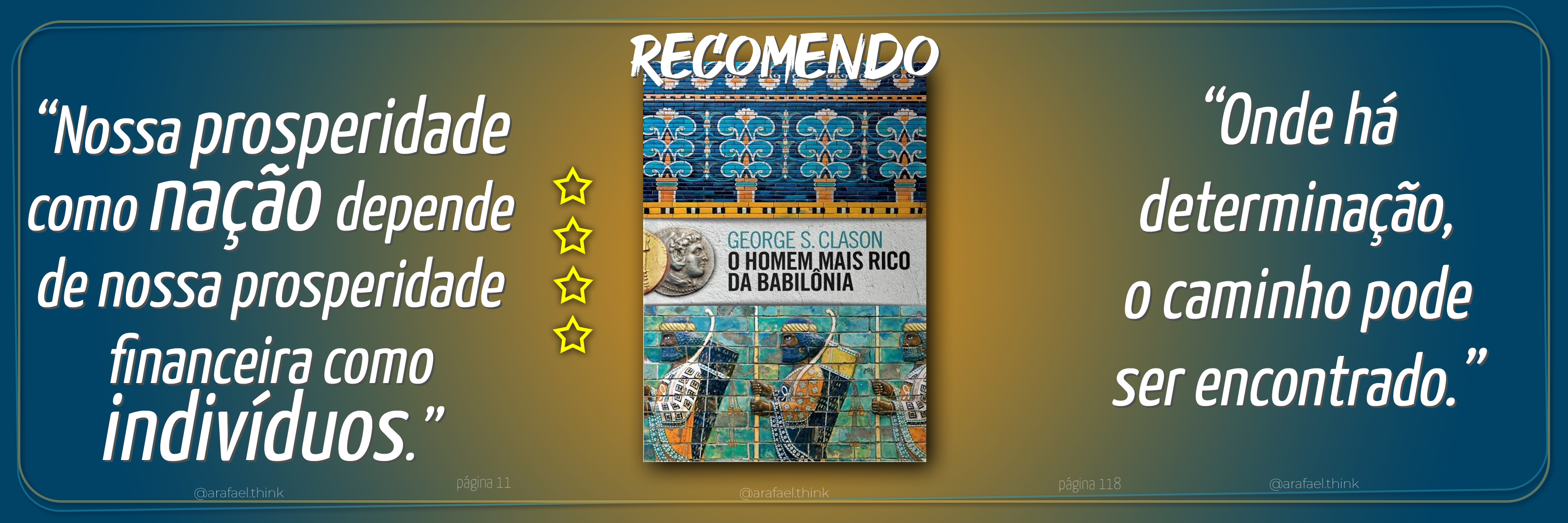 O livro “O Homem Mais Rico da Babilônia”, escrito por George S. Clason, ilustra lições sábias e exemplos de como multiplicar riqueza, solucionar problemas financeiros e não ser manipulado pelo dinheiro ou refém de dívidas. Você identificará valiosas estratégias em histórias de fácil interpretação.