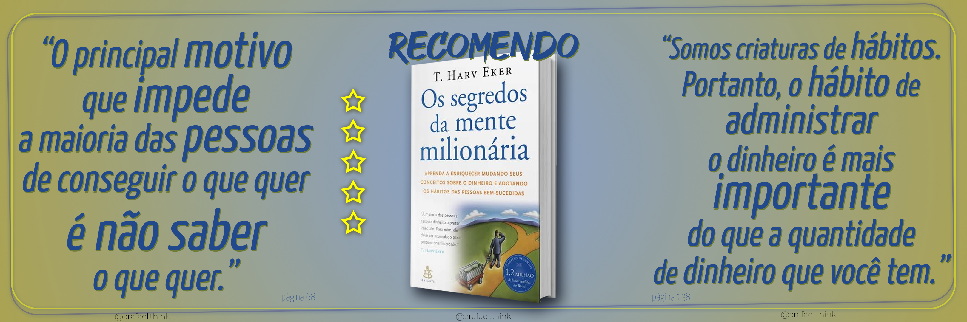 Falando do livro “Os Segredos da Mente Milionária” de T. Harv Eker, finalizei a leitura no mês passado. Já havia começado em 2013, mas não cheguei a terminar. Este é um livro fundamental para quem deseja realinhar seu estilo de lidar com as finanças, adotando hábitos das pessoas bem-sucedidas. Recomendo a todos que querem aumentar sua riqueza financeira, mental e emocional.