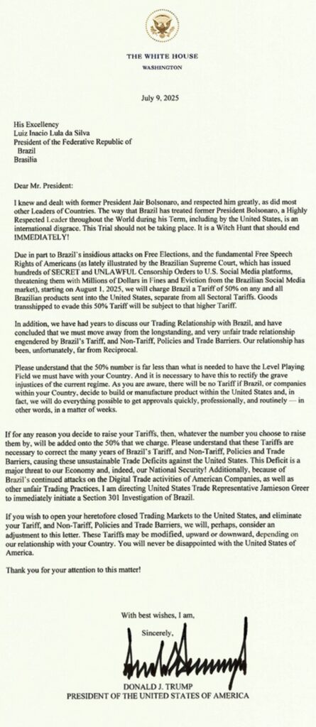 A guerra comercial com ataques de porcentagem entre EUA e China esfriou. Agora, o presidente Donald Trump virou a mira para a América do Sul. No final da noite de ontem tivemos o anúncio do presidente dos Estados Unidos, Donald Trump, de impor tarifas de 50% sobre todos os produtos brasileiros a partir de 1º de agosto de 2025, representa um marco nas relações comerciais entre Brasil e EUA. A medida, de forte cunho político (além das tarifas é citado o ex-presidente Jair Bolsonaro e as decisões do SFT em relação as big techs) e econômico, surpreendeu o mercado e trouxe incertezas para exportadores, investidores e para o próprio governo brasileiro.