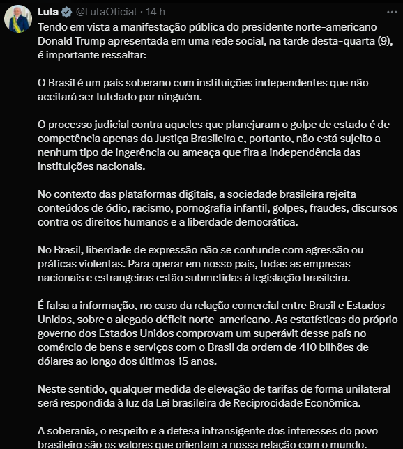 O presidente Lula, após reunião, em sua página na rede social X (antigo twitter) direcionou um comunicado mencionando sobre a soberania brasileira e que poderia haver reciprocidade nas tarifações.